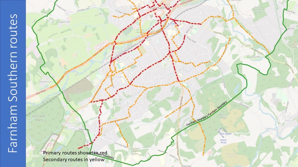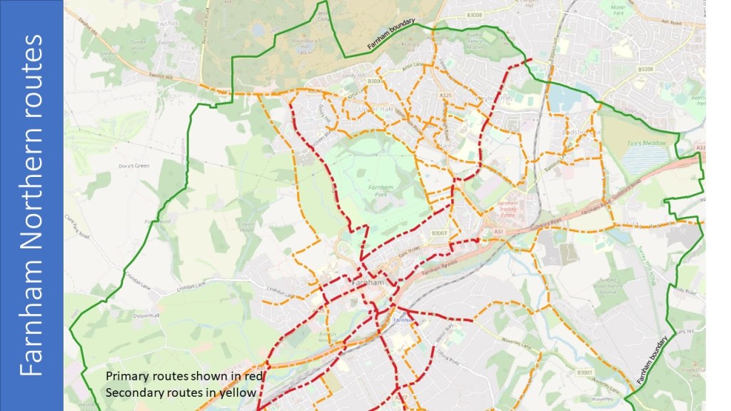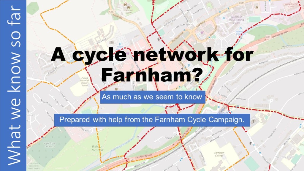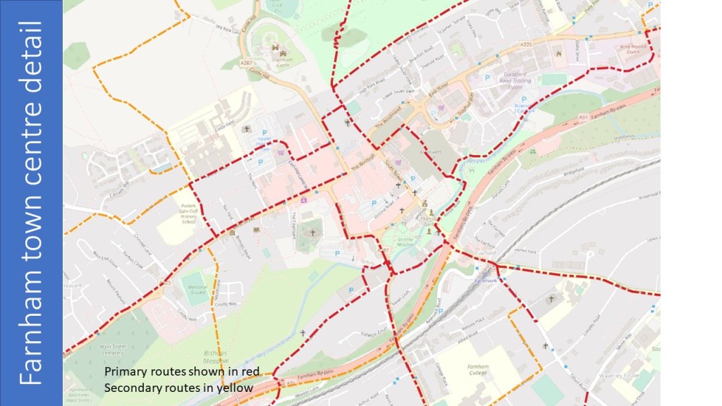Many moons ago, the various tiers of local government set out to draft Local Cycling and Walking Infrastructure Plans (LCWIP) for Surrey including one for Farnham. A bid would be made to the Department for Transport – among others – to fund it.