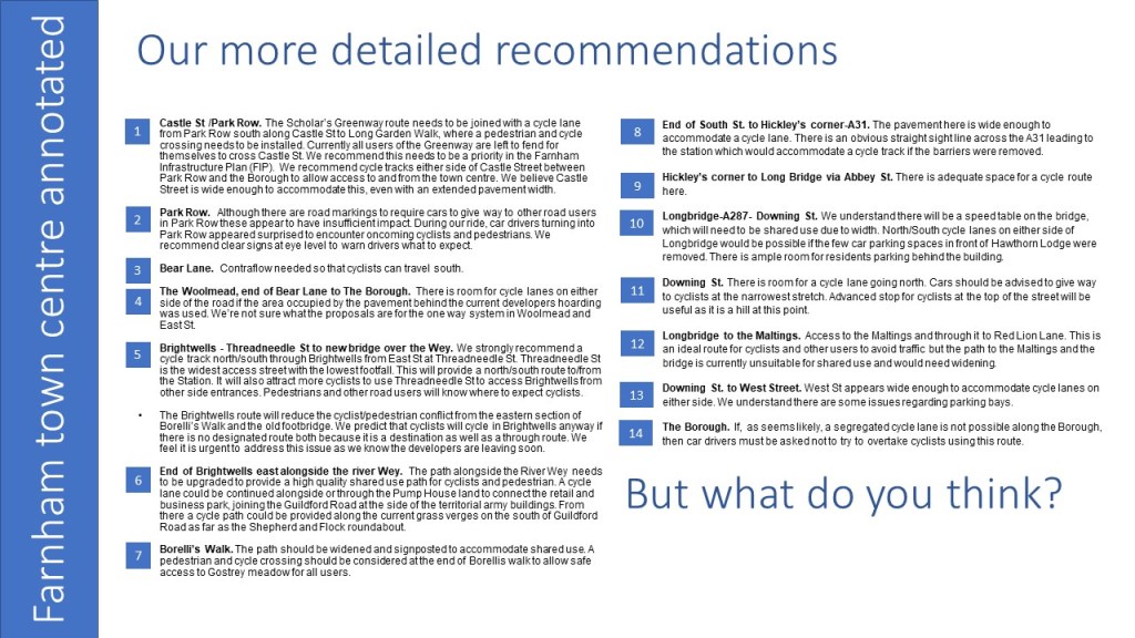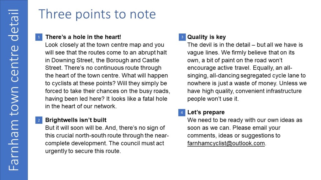 We need to be ready with our own ideas as soon as we can. Please email your comments, ideas or suggestions to farnhamcyclist@outlook.com.